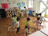 雨の日は室内あそびでも全身を使ってみんなで楽しく過ごしています。隣のフラフープに向かってジャンプで進むよ。出来たかな~?
