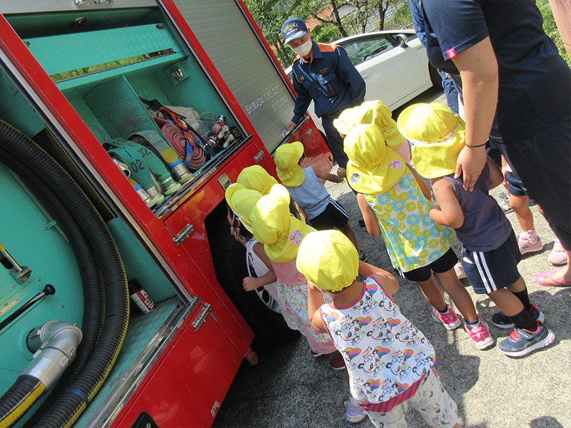 年長児の花火教室の後、消防車を見学させて頂きました。みんな興味津々!
