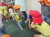 テラスでシャボン玉遊びをしたあひるぐみ(1歳児)年長さんが一緒に遊んでくれました。