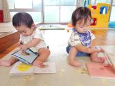 0歳児。しかけ絵本を触ってめくって指先の感触を楽しんでいます。