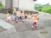1歳児。園外にお散歩へ。坂道では先に登った子が応援しながら全員揃うまで待ちます。「がんばぁれ!」